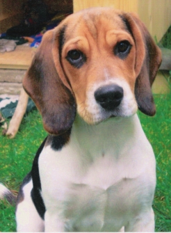 Beagle Hündin Bessi vom Rittergut auf braunem Fotokarton