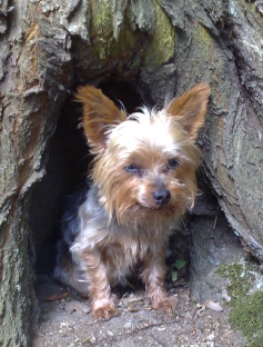 Yorkshireterrier-Hündin "Betsy" auf graueem Fotokarton