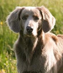 Weimaraner Hündin "Cilly vom Fehn", auf beigem Fotokarton.
