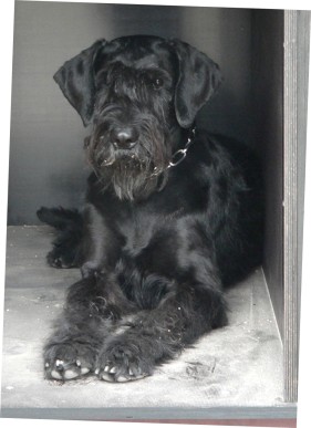 Riesenschnauzerhündin "Cleo" auf weißem Karton