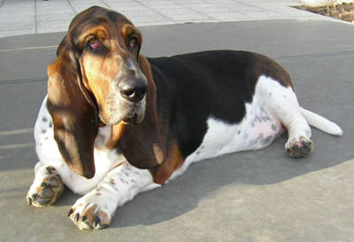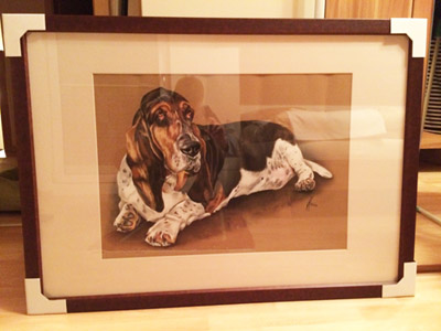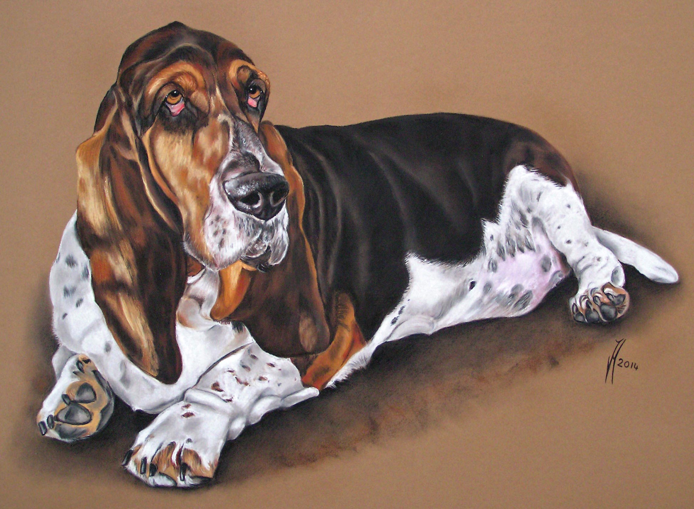 Kohle-/Pastellzeichnung Basset "Columbo" auf braunem Fotokarton