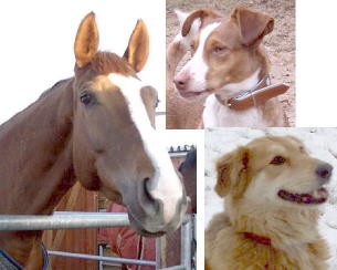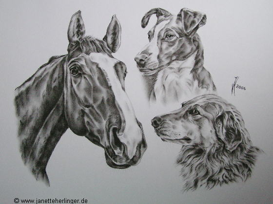 mare "Dirana" and female dogs "Lucy and Emma" on white cardboard