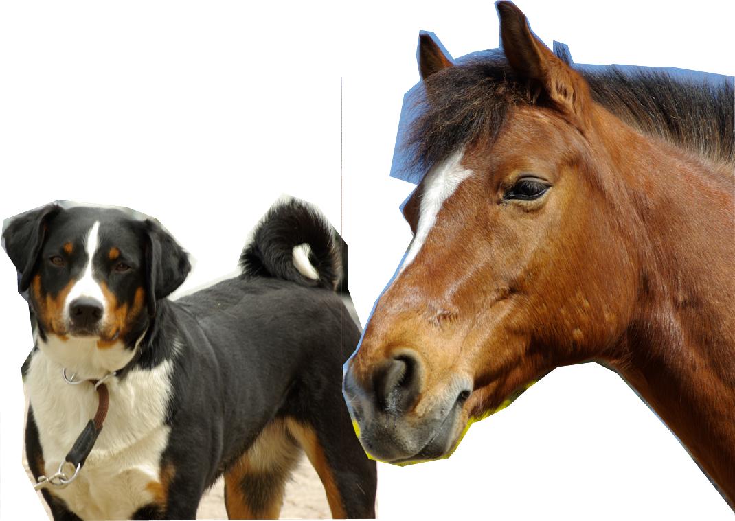 Wallach "Don" mit Appenzeller Hündin "Giggels" auf beigem Fotokarton.