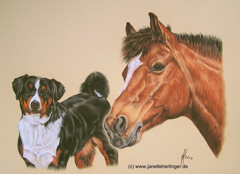 drawing Gelding "Don" and female Appenzeller "Giggels" on beige cardboard.