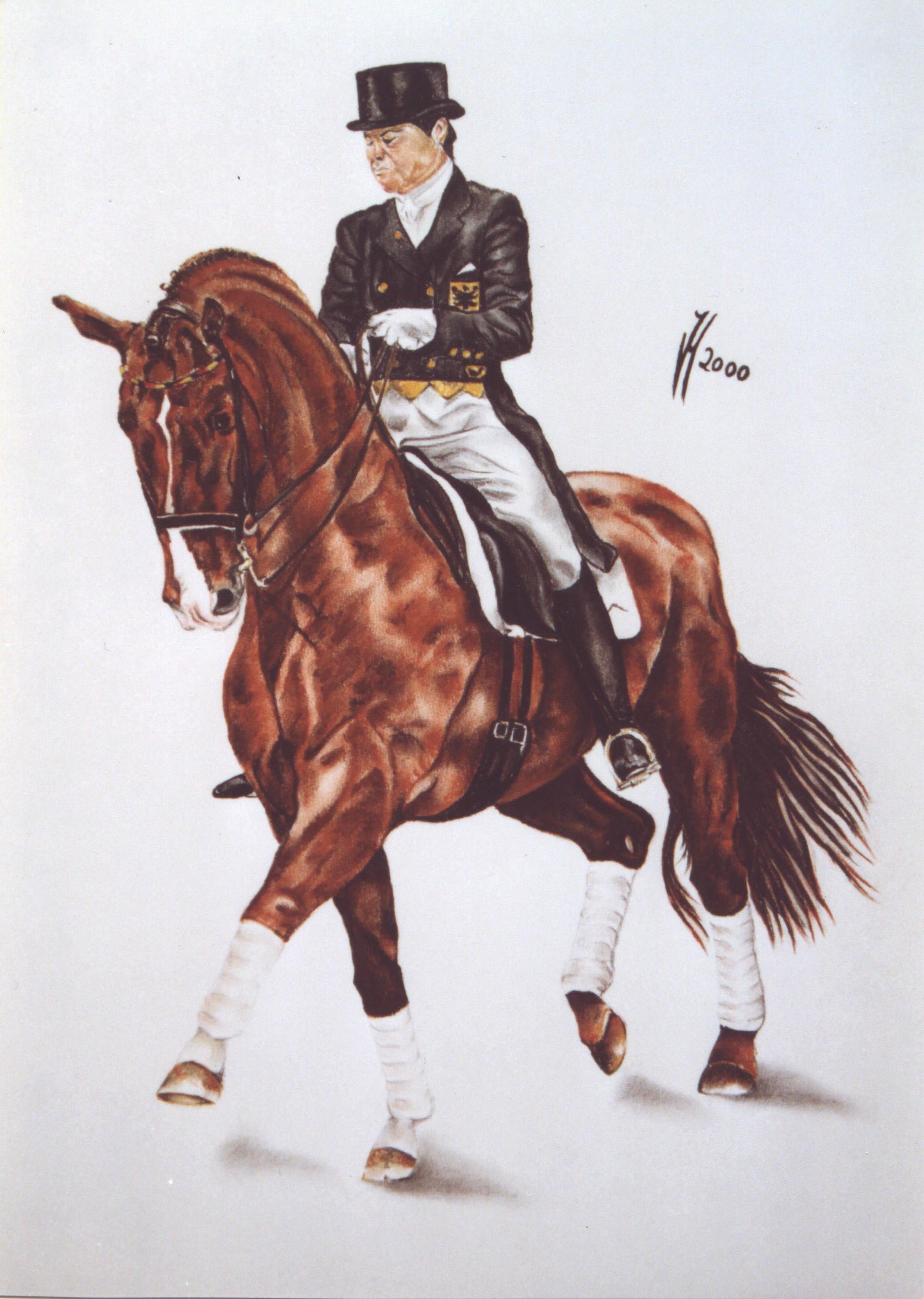 drawing Oldenbourg stallion Donnerhall with rider Karin Rehbein on