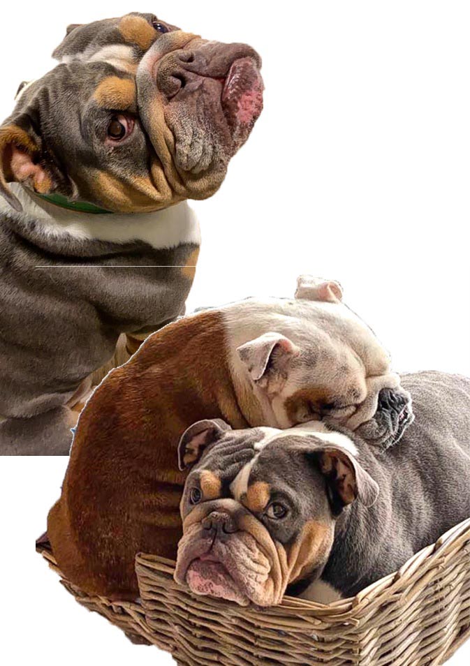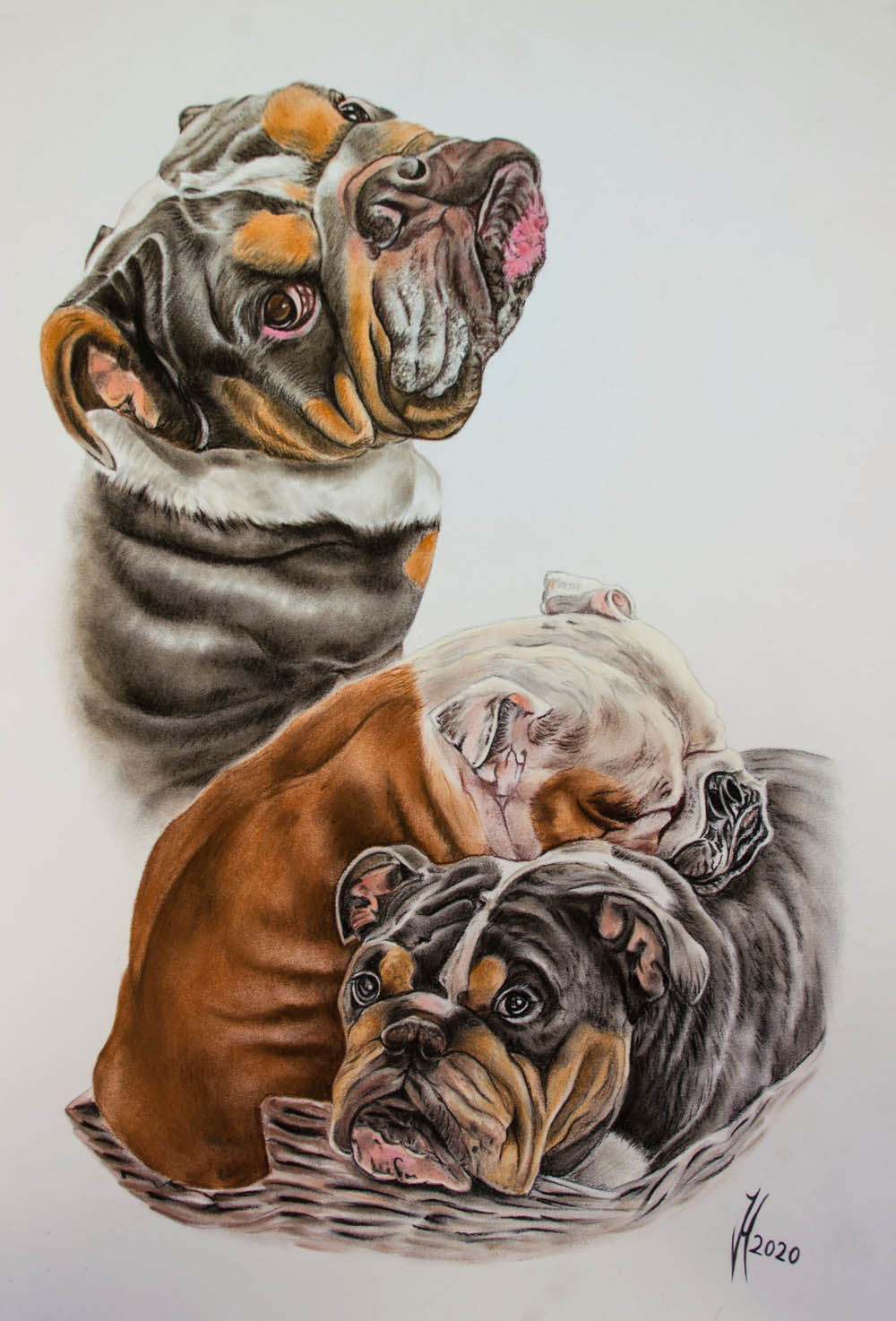 Kohle-/Pastellzeichnung Bulldoggen "Elli & Pelle" auf