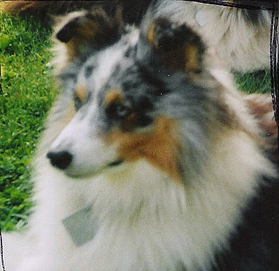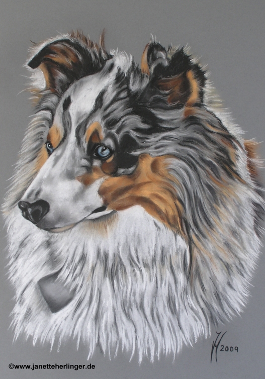 drawing of the male Australian Shepherd Finn on grey cardboard.