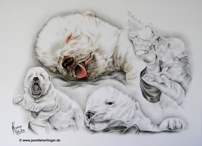 kombiniert mit 3 Kohlezeichnungen vom Eisbärbaby "Flocke" auf