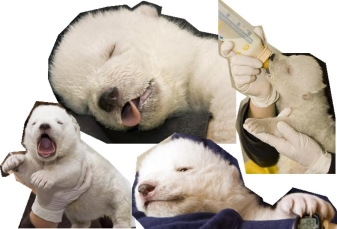 drawing combined with charcoal drawing of polar bear baby "Flocke" on white