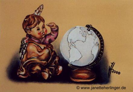 Kohle-/Pastellzeichnung Hummel-Figur "Indianer"auf beigem Karton Charcoal/Pastel drawing Hummel sculpture "Indian" on beige cardboard