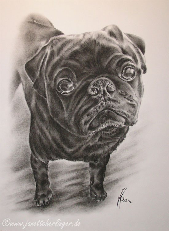 Kohlezeichnung Mops "Kingston" auf weißem