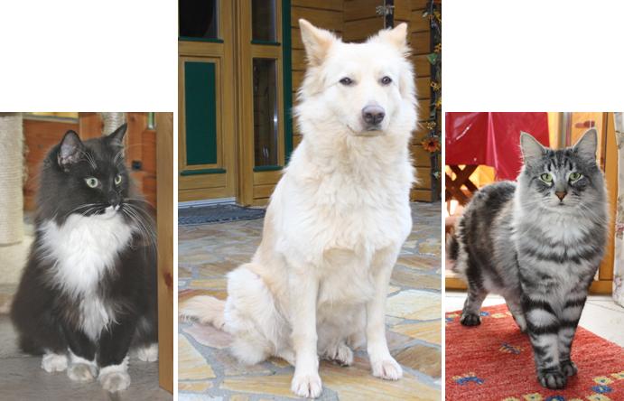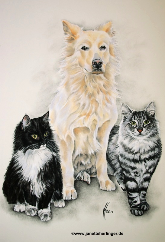 drawing male Norwegian wood cats "Teo & Pavarotti" and female dog "Emma"