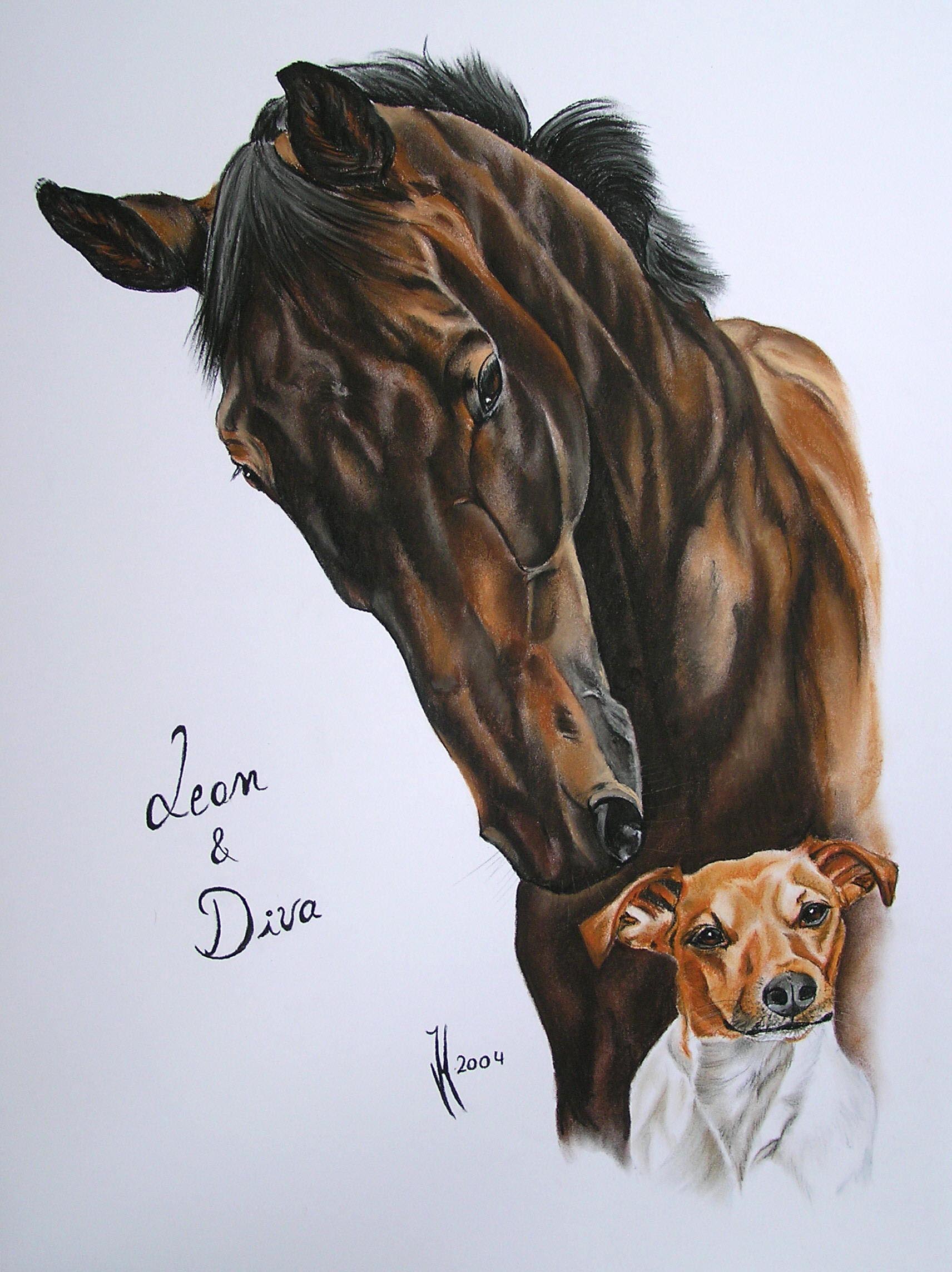 drawing darkbrown gelding Leon and Jack-Russel female Diva on white cardboard