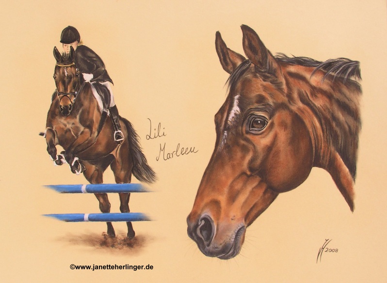 drawing of jumping horse "Lili Marleen" over the hurdle and head portrait