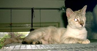 einäugige Katze "Minouche" auf beigem Karton
