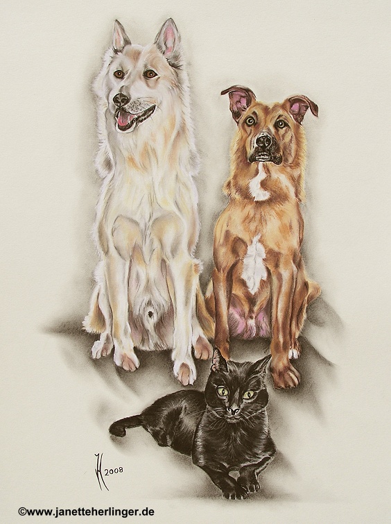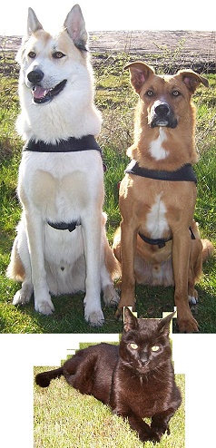 drawing Husky-mixes "Bruno and Henry" and black male cat "O'Malley" on