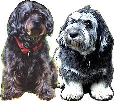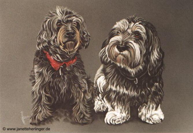 Mischlingshunde Polly und Merlin auf grauem Karton