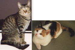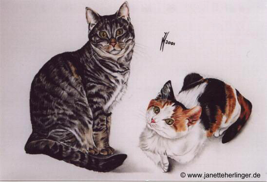 drawing tigered and threecoloured house cats Sheena and Muschka on white