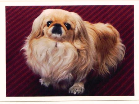 drawing goldblonde Pekinese female "Sina" on beige cardboard.