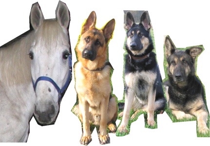 Schimmelwallach "Don" mit den Schäferhunden "Living",