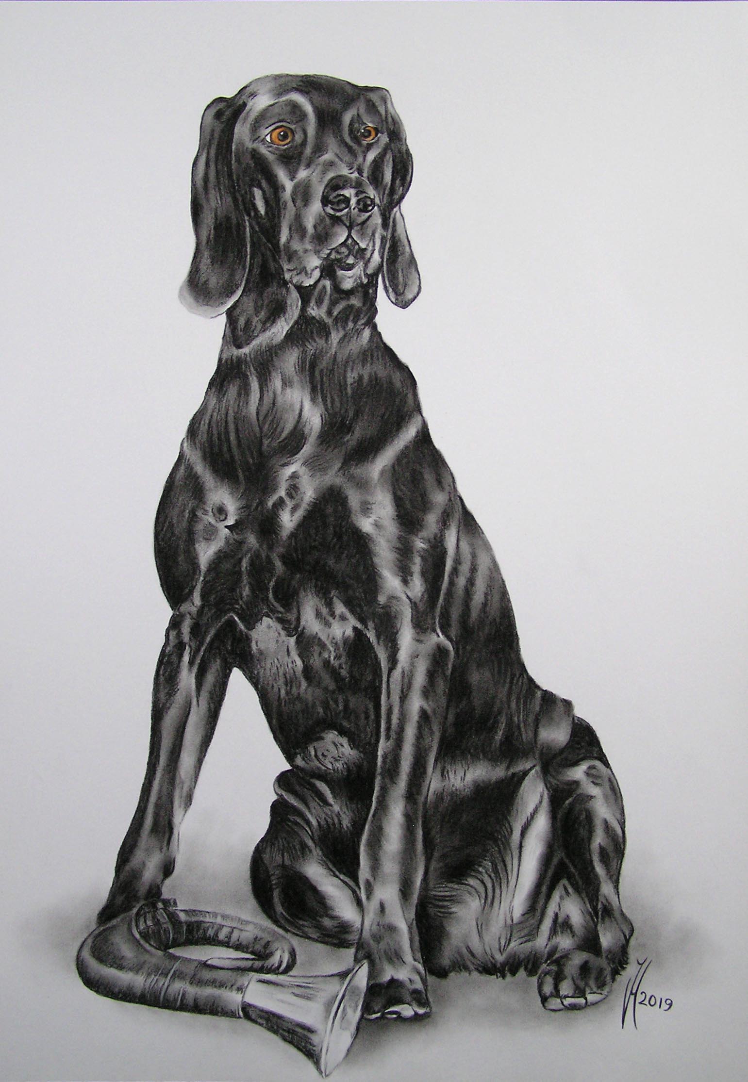 Charcoal drawing hunting dog "Immo" on offwhite