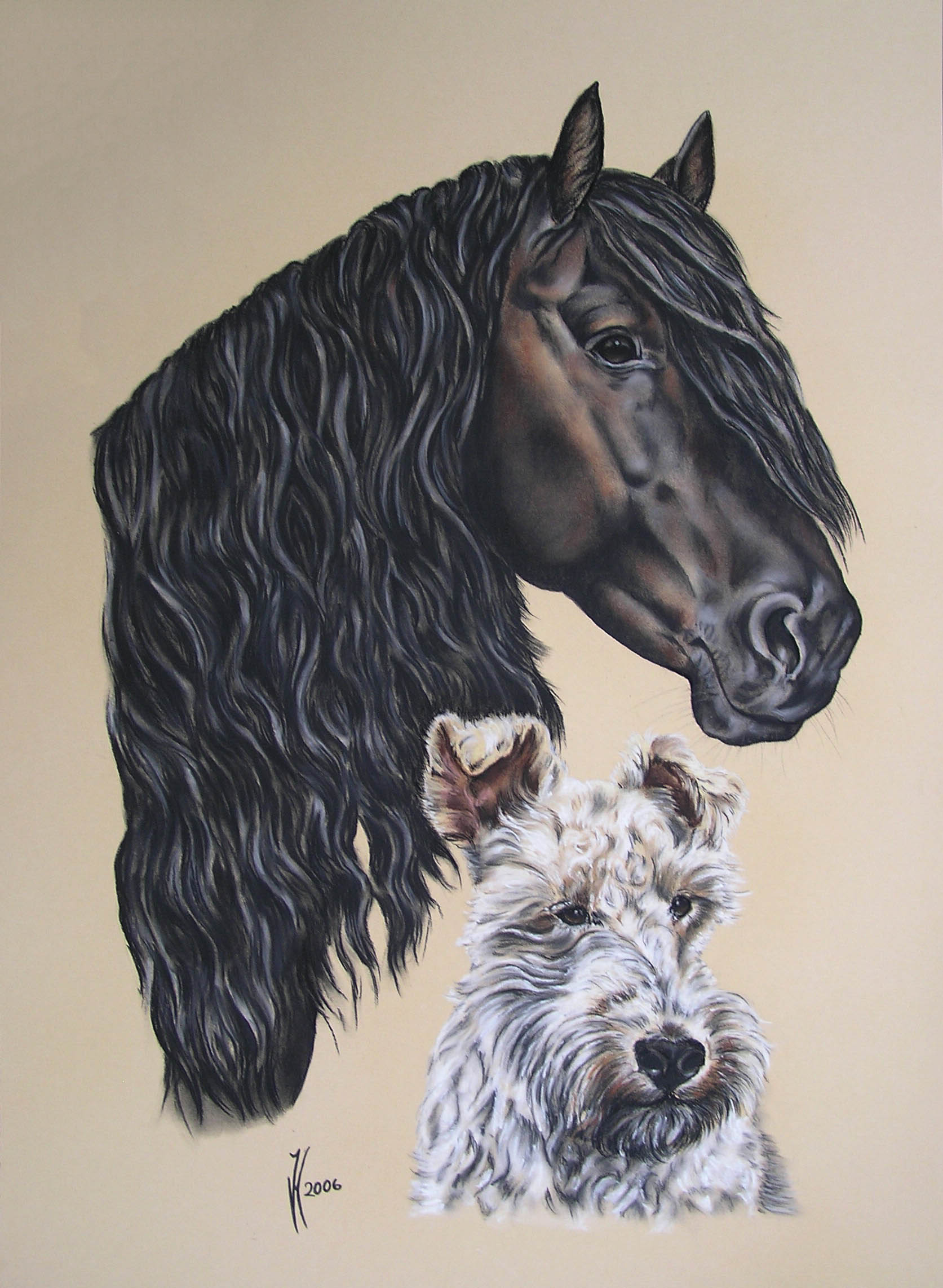 drawing frisian gelding Romke and Foxterrier female dog Elfe on beige cardboard