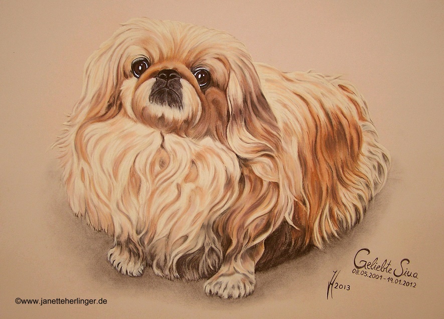drawing goldblonde Pekinese female "Sina" on beige cardboard.